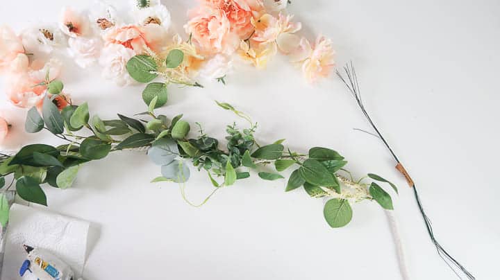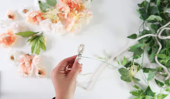 Placez votre premier morceau végétal sur le dessus de la corde et utilisez du fil de fer floral pour attacher les 2.